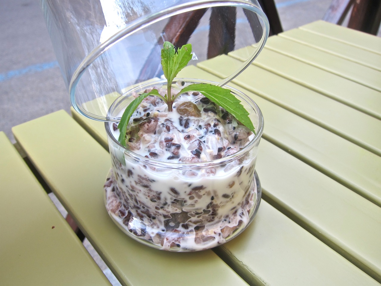 It was served in a cool-looking glass with its own glass cover. Inside was a mix of black and white rice, raisins, amaretto, sesame, and walnut. It tasted like a fancy rice pudding.